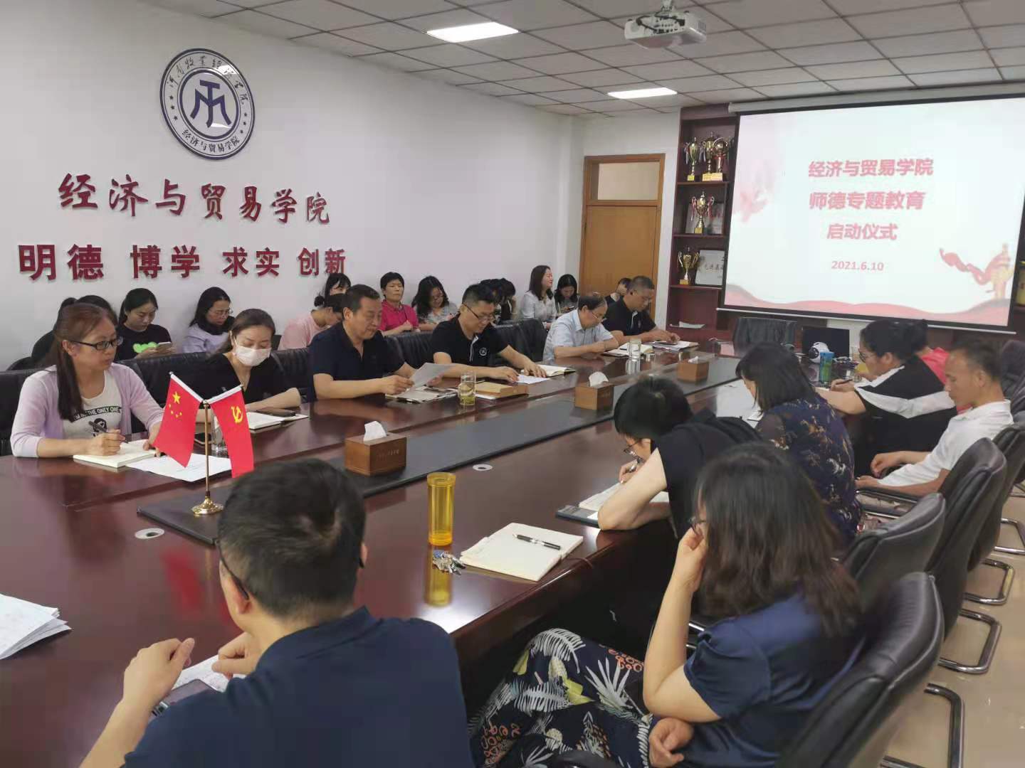 启动仪式上,李光院长领学了《新时代高校教师职业行为十项准则》,杜玲副院长宣读了《违反师德高校教师案例》,张松刚书记传达了《关于在教育系统开展师德专题教育的通知》精神,并对做好师德专题教育活动提出了几点要求:一是要充分认识新时代加强教师师德师风建设的重大意义。教育承担着为党育人、为国育才的神圣使命,肩负着立德树人、培养社会主义建设者和接班人的根本任务;教师的思想政治素质和师德师风关乎学生成长成才,关乎教育改革发展,关乎社会文明风尚,关乎国家长治久安,要始终从“两个大局”的高度,切实增强做好教师思政和师德师风建设工作的思想自觉和行动自觉;二是要积极参与主题活动,不断提升政治意识和师德修养。要把牢正确方向,狠抓教师队伍政治建设;要聚焦重点人群,加强青年教师思想引领;要坚持德法并举,健全落细落实体制机制;要强化正面引领,增强教师荣誉感使命感。