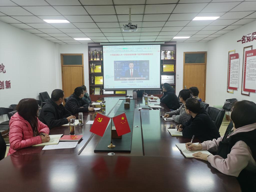会上,院党委书记张松刚介绍了2023年全国两会的基本情况,系统总结了两会召开的时代背景、政治意义、做出的重大决策部署以及取得的一系列辉煌成果,重点传达领学了习近平总书记的重要讲话精神。随后,与会人员认真收看了《十四届全国人大一次会议在京闭幕 习近平发表重要讲话》的新闻报道,大家一致表示,要深入学习领会两会精神,坚定历史自信,彰显使命担当,在新时代新征程中更好发挥教师立德树人的天职,以学院高质量发展不断推动学校教育事业的改革创新。