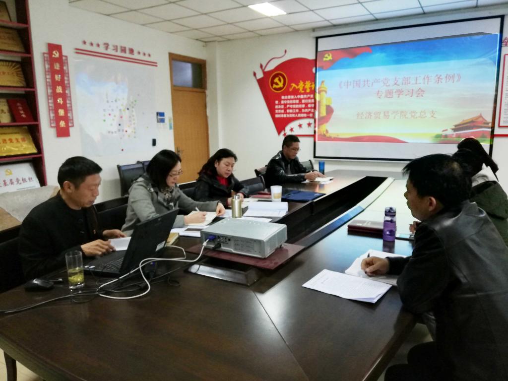 11月29日下午,经济贸易学院党总支在英才校区教学办公楼216会议室召开了学院中心组理论学习扩大会议,组织学习了新修订的《中国共产党支部工作条例(试行)》(以下简称《条例》)。会议由党总支书记牛建绥主持,总支委员及各支部书记参会。