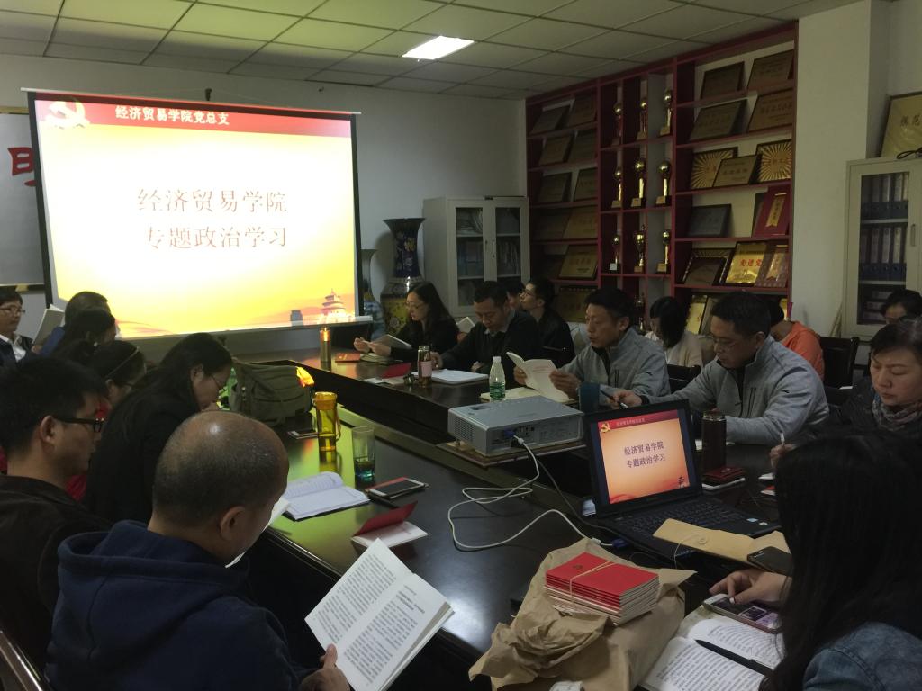 11月2日下午,经济贸易学院党总支在英才校区教学办公楼216会议室,组织全院教职工开展专题政治学习,落实校党委组织部关于开展共产党员“戴党徽、作表率”活动的通知要求,进一步深入学习宣传贯彻党的十九大精神。会议由党总支书记牛建绥主持。