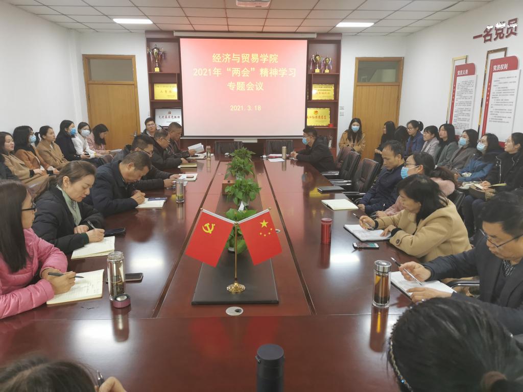 张书记强调,全院党员干部要提高政治站位,凝聚思想共识,把学习宣传全国“两会”精神,贯彻落实习近平总书记重要讲话精神作为重大政治任务,进一步增强“四个意识”、坚定“四个自信”、做到“两个维护”。一是要学习领会党和国家对2021乃至十四五期间的发展目标和工作部署,做到眼明心亮、坚定信心和国家的发展同向同行;二是要明确党和国家对办人民满意教育的最新要求,跟上教育改革方向和顺应教育改革趋势,特别是要落实好立德树人,建设高质量教育体系;三是要积极了解掌握党和政府未来经济社会发展的规划部署,特别是在加快发展现代产业体系、国内国际双循环新发展格局、构建高水平社会主义市场经济体制、全面推进乡村振兴、提升城镇化发展质量、优化区域经济布局等方面和我院的学科专业方向以及科研领域关系密切,是我们落实“两性两型”办学定位,服务区域经济社会发展、服务行业企业、服务乡村振兴开展人才培养和科研工作的基本遵循;四是要加强师德师风建设,提升教书育人本领。要落实习总书记指示,做四有好老师,继承发扬老一辈教育工作者“捧着一颗心来,不带半根草去”的精神,以赤诚之心、奉献之心、仁爱之心投身教育事业。