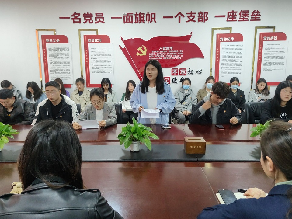 在嘹亮的国歌声中,“我为评估做贡献,党员模范作先锋”主题党日活动开始。首先由学生党支部党员学习小组代表发言,孙梦雅、朱满菊、姬素雅等党员同志通过发言向大家表达了作为党员在评估期间,要在日常学习、学风建设、学生工作等方面切实发挥党员的先锋模范作用,突出表达了各党员同志争当党员模范先锋的决心。紧接着由教师党员代表董锦洋发言,他讲到学生党员的第一身份是党员,作为一名中国共产党员要积极响应学院党委和学校党委的号召,牢记党员身份,发挥主观能动性,为我校顺利通过教学评估做出自己的贡献。之后,党委书记张松刚与党委副书记贾艳艳分别为各支部党日活动做总结讲话,张书记为即将到来的本科教学评估冲刺做动员,对广大党员群体前期工作做了充分的肯定,鼓励大家再接再厉,发挥党员先锋模范作用,为我校评估工作多做贡献。贾书记也鼓励各学生党员要身体力行,注重实践,不要空谈,积极参与党员活动,争当党员模范,为即将到来的迎评工作争光添彩。最后,由各支部学生党员代表带领大家重温入党誓词。在党员同志们洪亮的宣誓声中,本次党日活动顺利结束。
